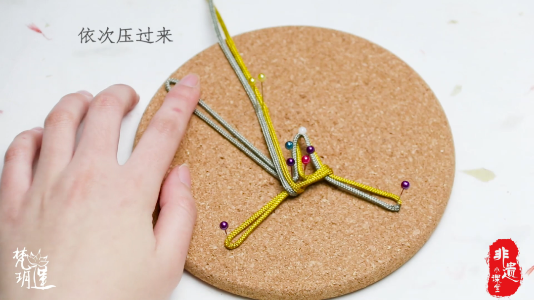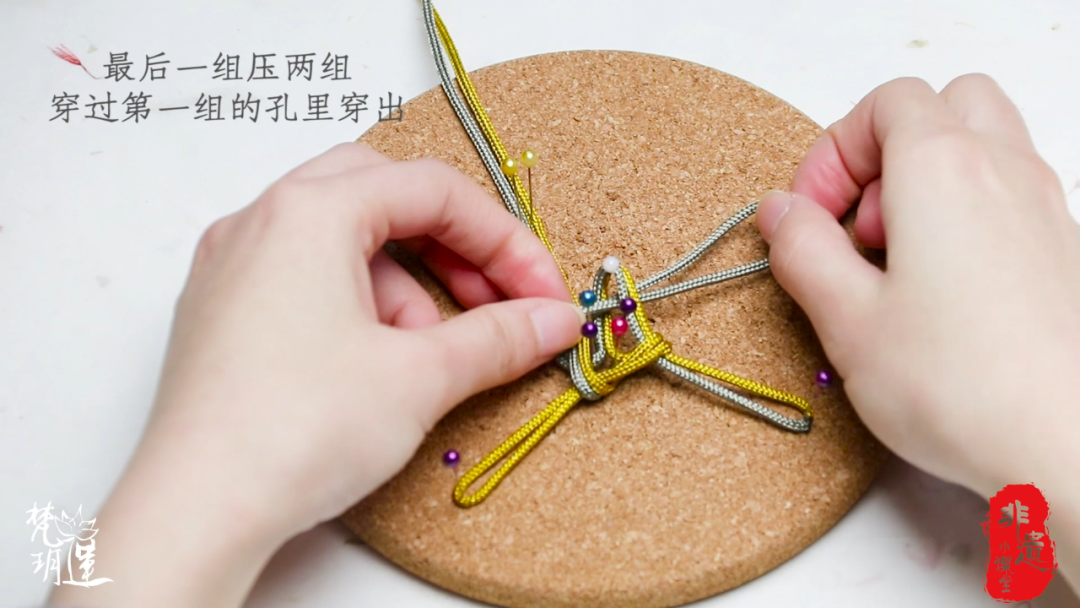 步骤四:最后一组压两组,穿过第一组的孔里穿出